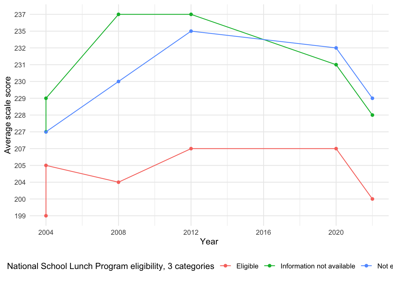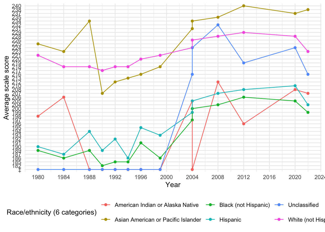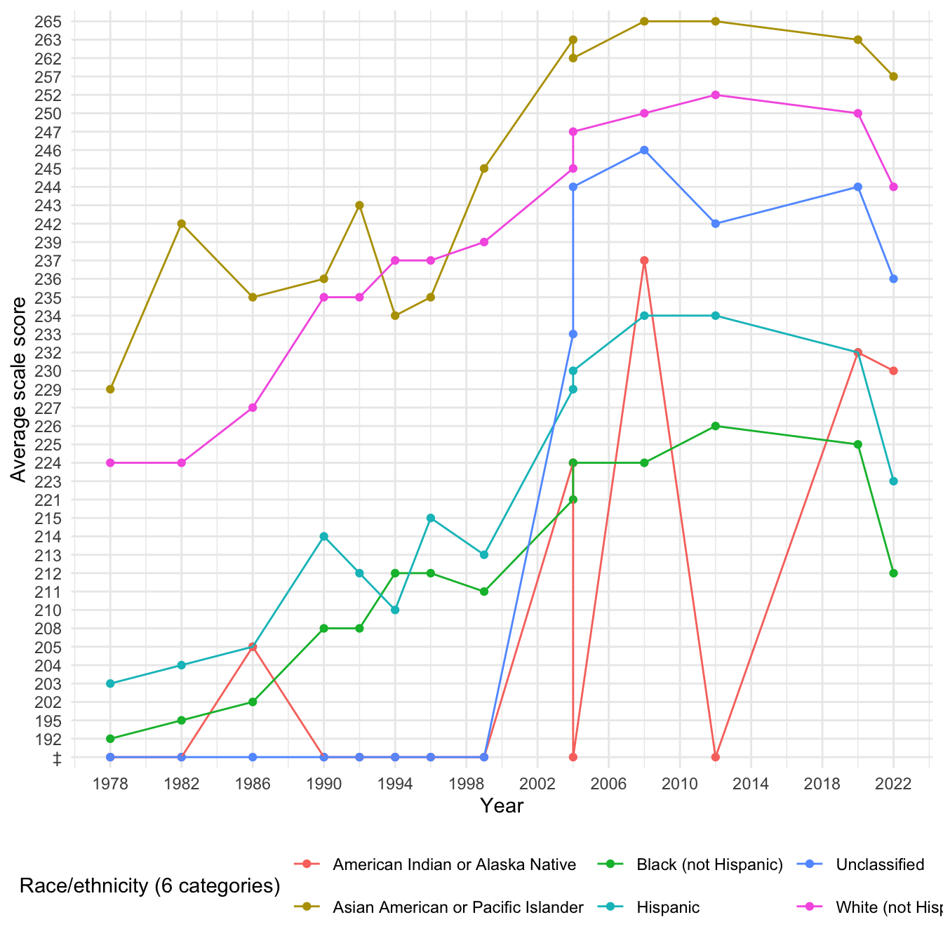 Similar to the graph for mathematics data for race, the special characters indicating missing values appear at the bottom of the y axis. Data is missing again 2016. There are 15 missing score entries in this dataset, mainly (‡) values. These are most commonly seen for “American Indian or Alaska Native” and “Unclassified” categories, likely due to insufficient sample sizes.