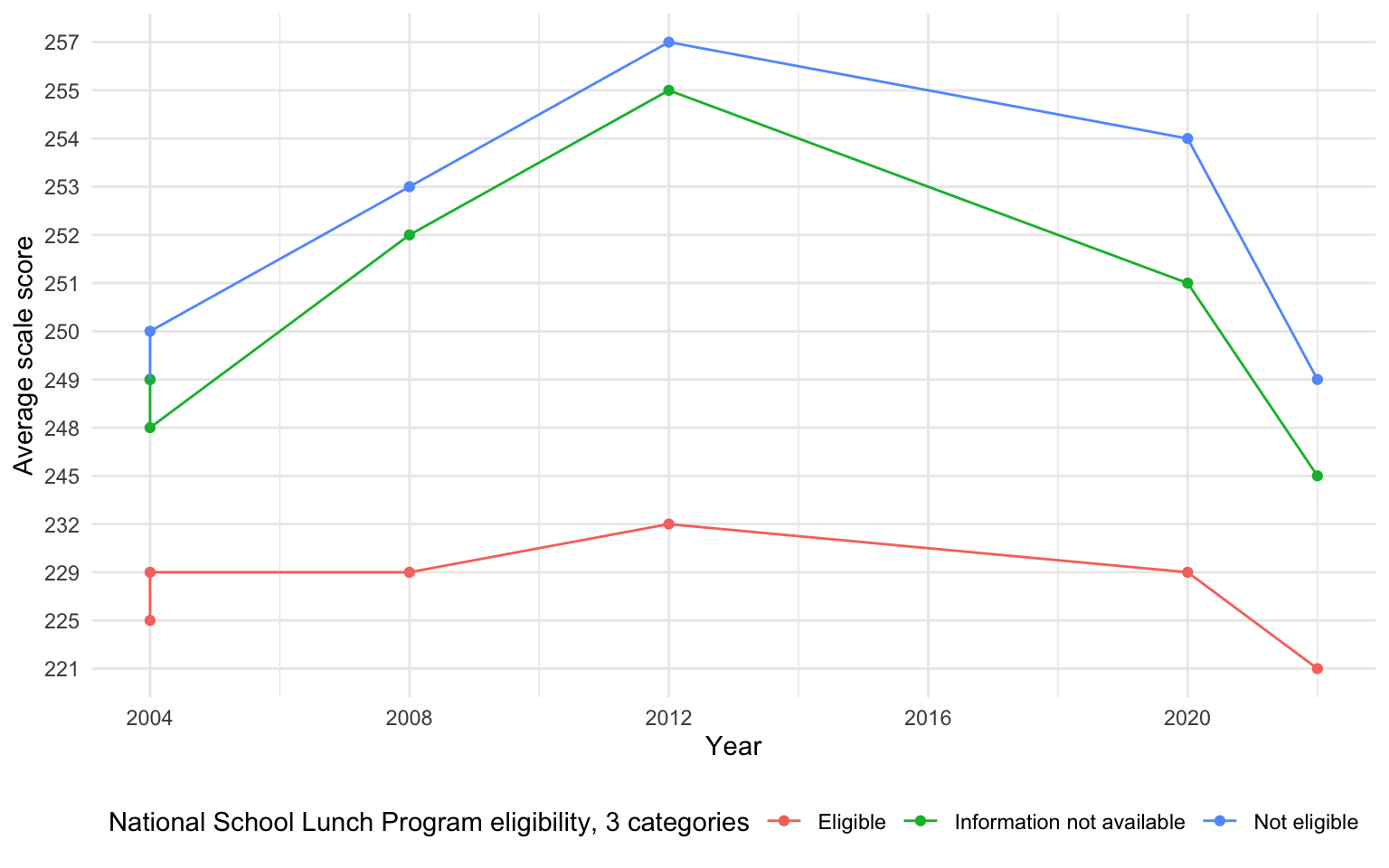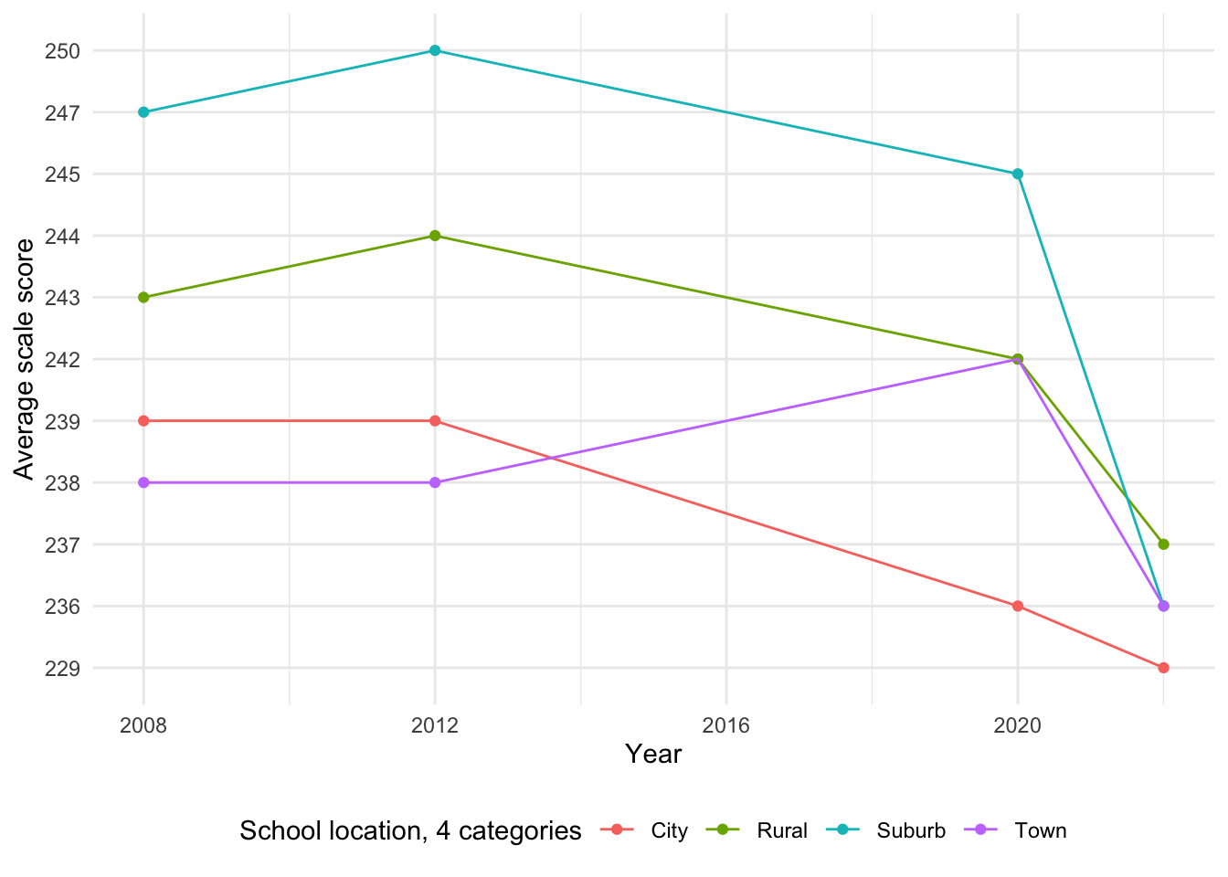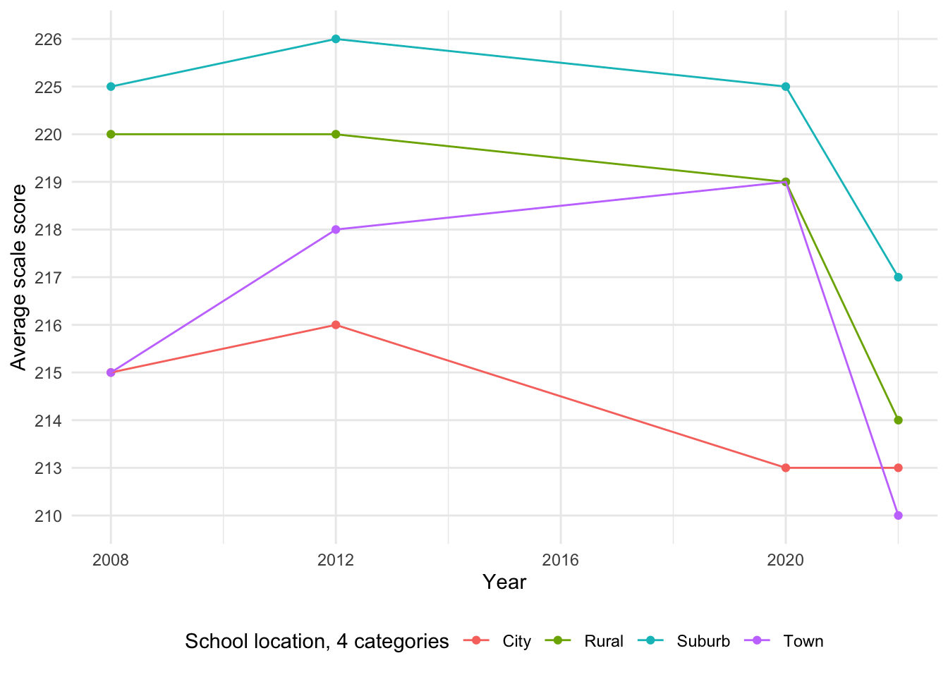 Similar to the graph for mathematics data for race, the special characters indicating missing values appear at the bottom of the y axis. Data is missing again 2016. There are 15 missing score entries in this dataset, mainly (‡) values. These are most commonly seen for “American Indian or Alaska Native” and “Unclassified” categories, likely due to insufficient sample sizes.