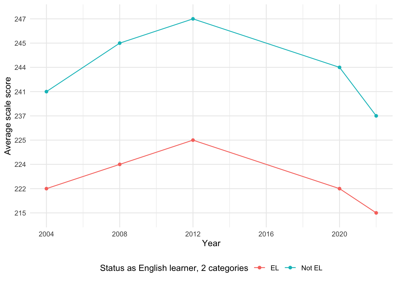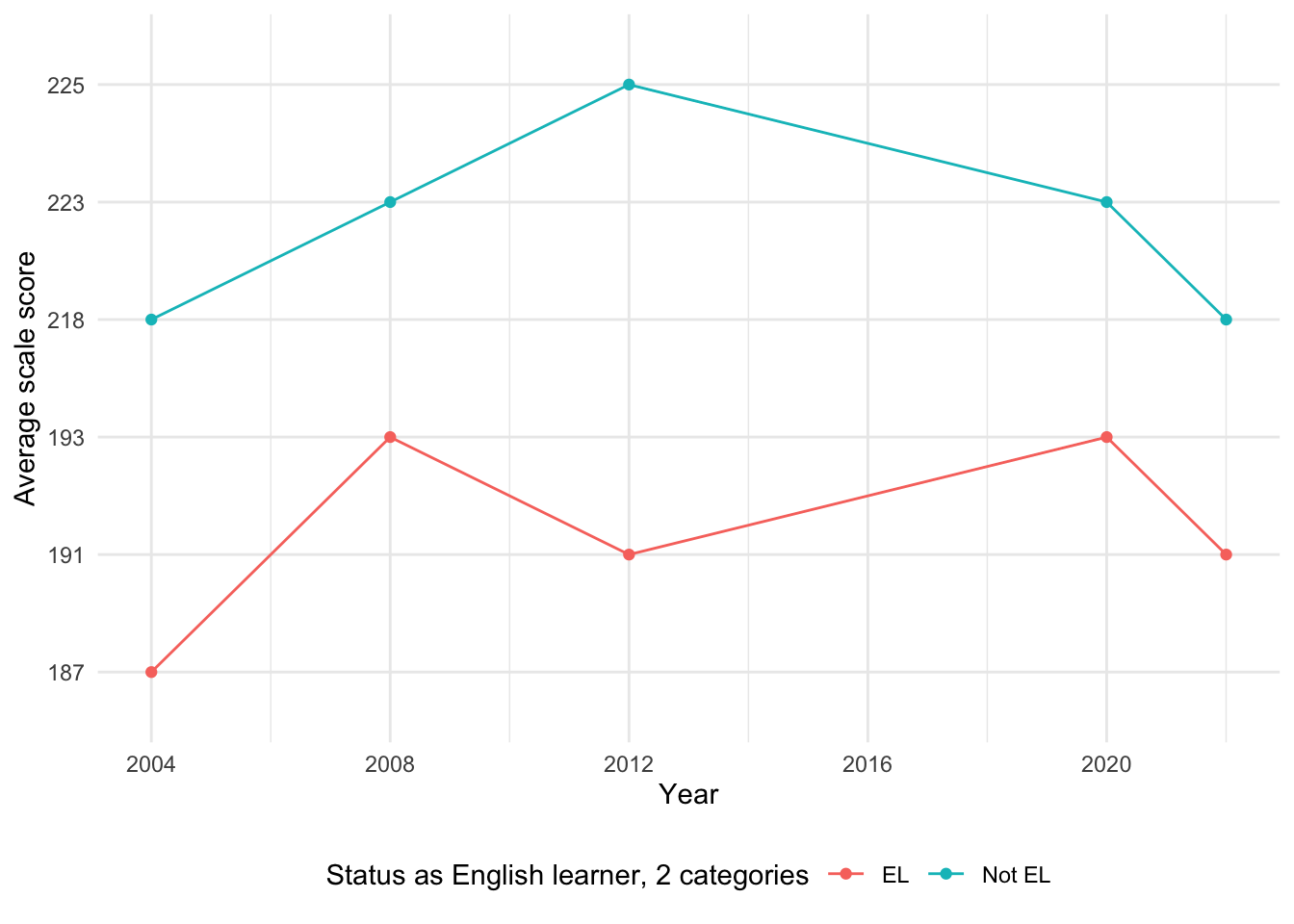 Unlike some previous variables, data for this variable is missing for 2004 as well as 2016. There are 48 missing values in the Average scale score column starting for earlier years including 1971-2004. #### Status as English Learner