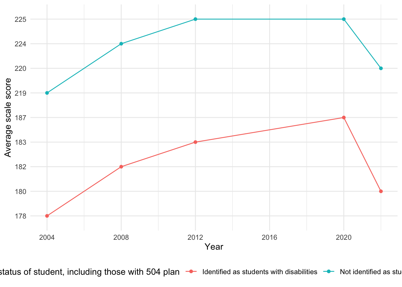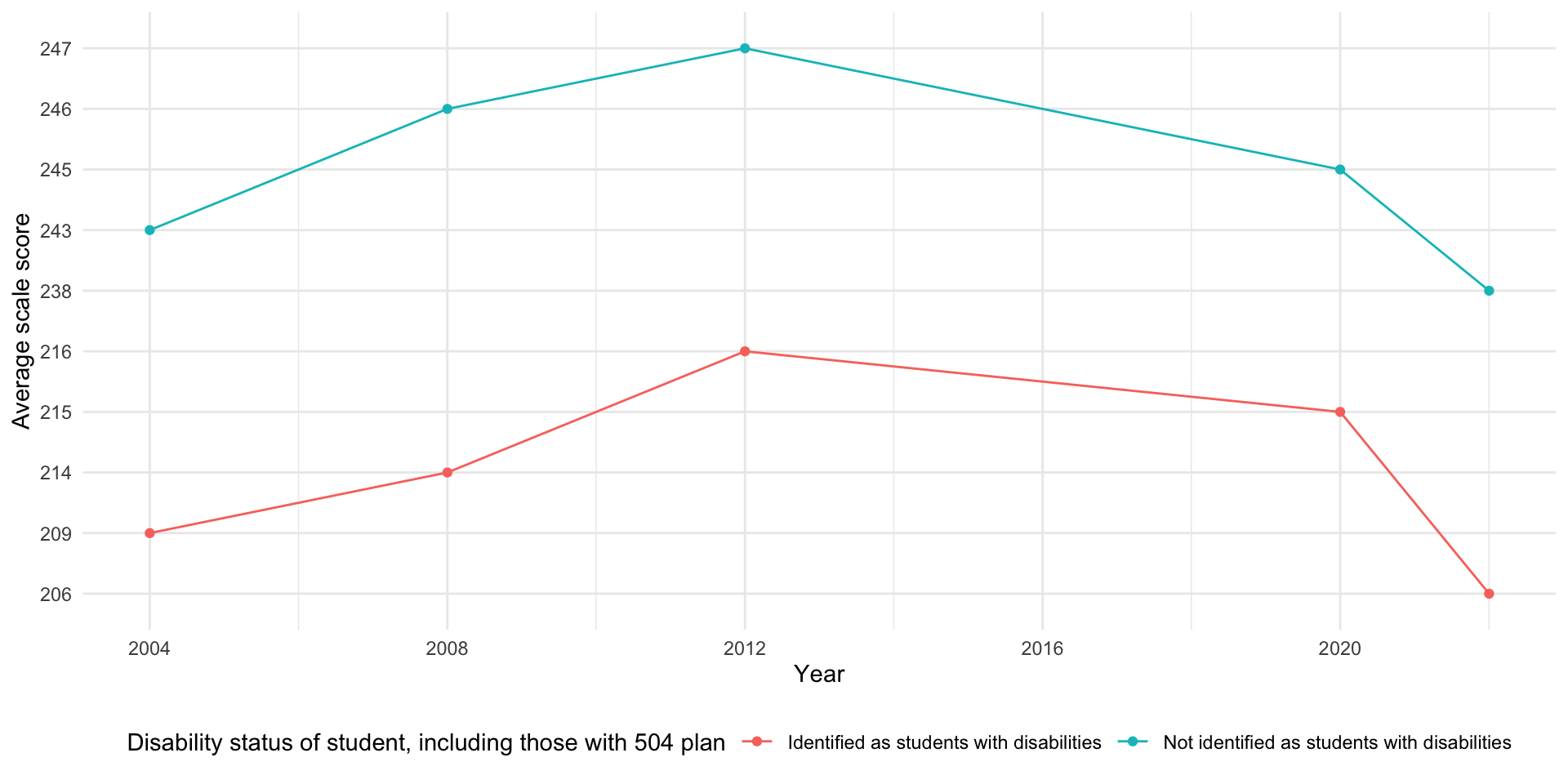 The 2004 data appears in two forms: one marked as valid and another flagged as ‘Original assessment format.’ The flagged data has missing scores (noted as ‘‡’), likely due to differences in assessment methodology during a transition year. This analysis includes only the standardized scores for 2004 and excludes flagged data to maintain consistency.