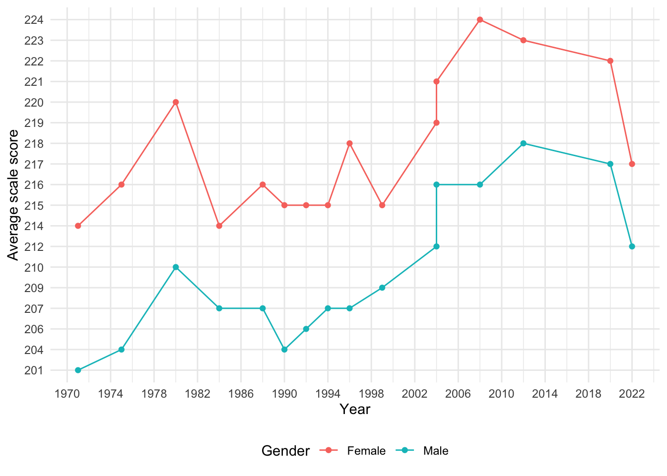 There appears to be missing data in 2016 in the gender category as well. There is also a vertical segment in the Male timeseries which is due to a transition from an “original” exam to a new exam version. The vertical segment reflects recorded values for the two versions of the exam in the same year. The scores for Female students were equivalent in both versions, so there is no vertical segment in that particular line graph.