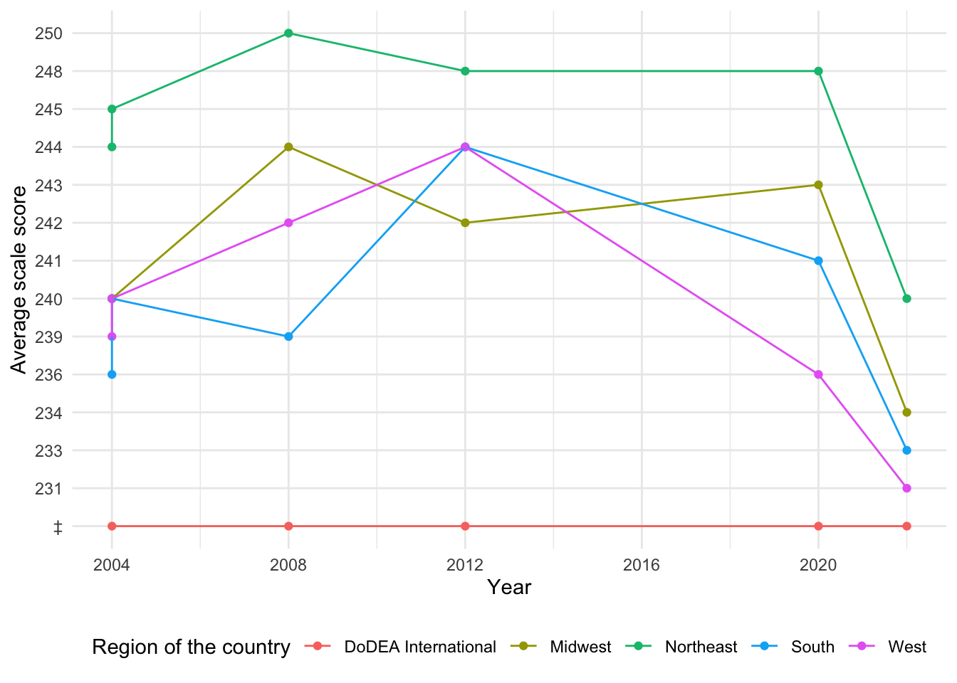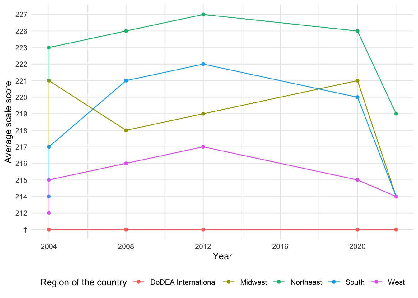 Here we see the same missing data patterns as before: vertical segments at 2004, missing data in 2016, and reporting standards not met for the DoDEA International region of the country. We also have N/A score data for years prior to 2004.